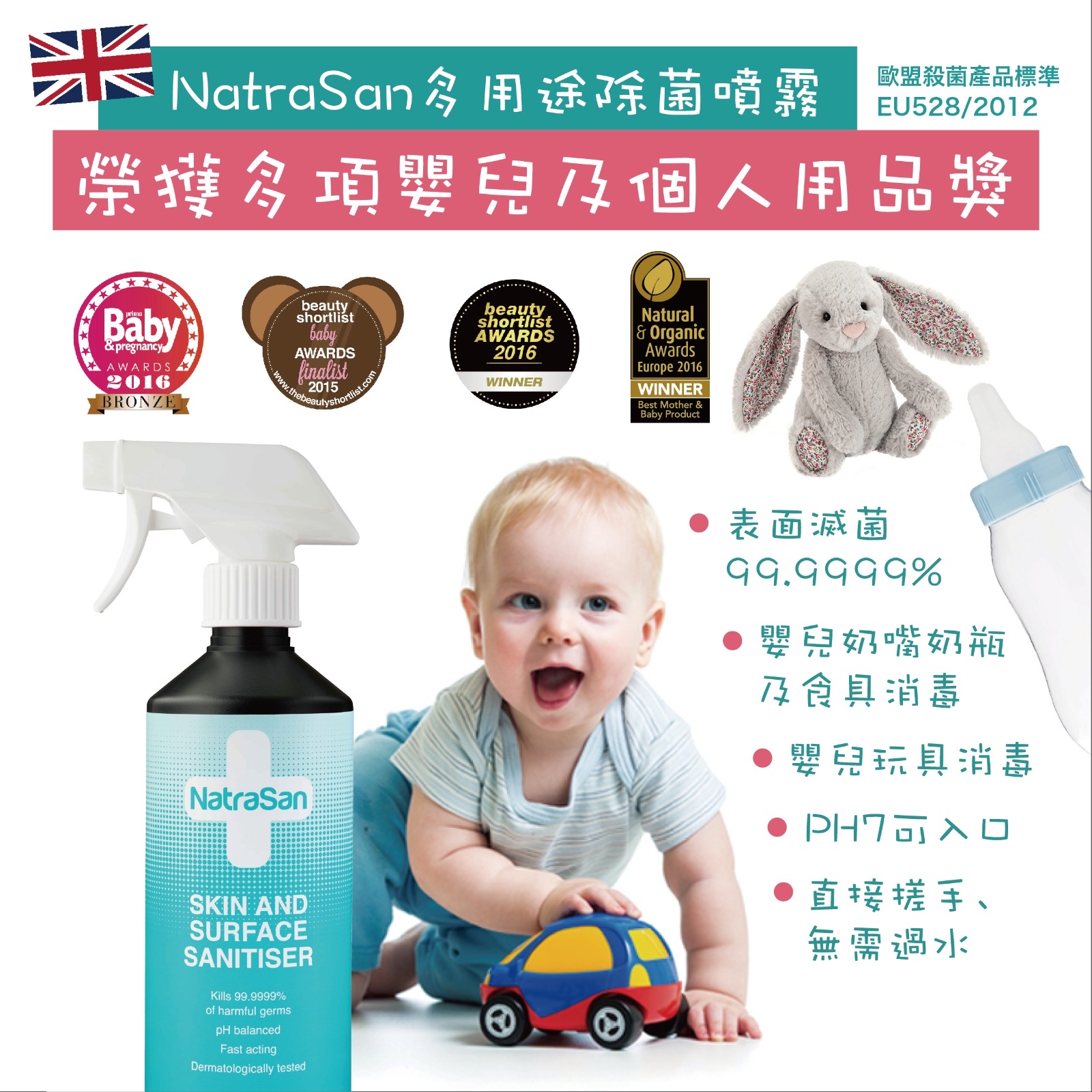 NatraSan可入口消毒噴霧是醫療保健的一次革命。首個次氯酸產品是完全符合歐盟標準的。它已按照嚴格的BSEN標準經過獨立實驗室測試,可有效抵抗所有類型的病原體。 它成分中含有純次氯酸hypochlorous acid,所有人類和動物體內都能產生次氯酸。它是我們白血細胞對抗包括細菌、病毒、真菌、酵母菌和黴菌而釋放出來的溫和而有效的酸性物質,但對人類、動物和環境都是安全的。 可直接噴在口中及眼角周圍,因為它是安全無化學物質的。 NatraSan能快速殺死99.9999%的有害微生物,包括耐甲氧西林金黃色葡萄球菌(MRSA),艱難梭菌(C Difficile),諾如病毒(Norovirus)等等。全家適用(包括嬰兒) NatraSan符合歐盟殺菌產品標準。產品的每個元素都經過了安全性,功效和保質期的測試。 監管及審批:符合EU528/2012要求;按照BSEN 1276, BSEN 1656, BSEN 13704, BSEN 14204, BSEN 13697標準已經測試 英國製造🇬🇧 ✅ 用作手部、皮膚的免洗消毒液 ✅ 幫助預防手足口病 ✅ 嬰幼兒用品(食具及玩具)的抗菌消毒噴霧 ✅ 抗菌及抗病毒的表面消毒 ✅ 擦傷, 割傷, 輕微燒傷和燙傷的急救殺菌消毒消炎噴霧 ✅ 舒緩並幫助皮膚疾病的癒合 ✅嬰兒尿布疹, 牛皮癬, 乳頭皸裂 ✅ 緩和蚊叮蟲咬而引起的發炎 ✅ 暗瘡及粉剌 ✅ 抗真菌的香港腳噴霧 ✅ 除臭或除味, 由細菌引致的異味如嘔吐異味... ✅ 作為漱口水清洗消毒口腔 *尤其是口腔潰瘍或者咽喉發炎 ✅ 可用作清洗化妝掃 ✅ 清洗生果,蔬菜(免沖水) 純天然PH7,安全無毒可入口 使用方法: - 手部、皮膚消毒:直接噴在表面,用於殺菌消毒。 - 創傷、蚊蟲叮咬:噴於患處,自然風乾。 - 痤瘡,紅腫,腳氣:噴於患處,自然風乾。 - 輕微燒傷、燙傷:如果可能的話,將燒燙傷部位浸入NatraSan液體中約10分鐘。否則就在用冷水沖洗燒燙傷部分時,期間不間歇噴灑NatraSan急救噴霧在冷水中,直至10分鐘。而後自然風乾。 NatraSan的樽身選用了一個高度防UV保護物料,免受紫外線的傷害,所以請不要轉移到其他容器存儲,並應避免陽光直射。 NatraSan在世界各地有許多藍籌客戶,包括醫院(感染控制),農業集團,超市集團,食品加工廠,獸醫診所等,他們使用我們的次氯酸鹽技術來對抗病原體。儘管您不知道,但我們的次氯酸鹽產品已經通過醫院,護理院,學校和托兒所中的感染控制使您和您的家人安全。